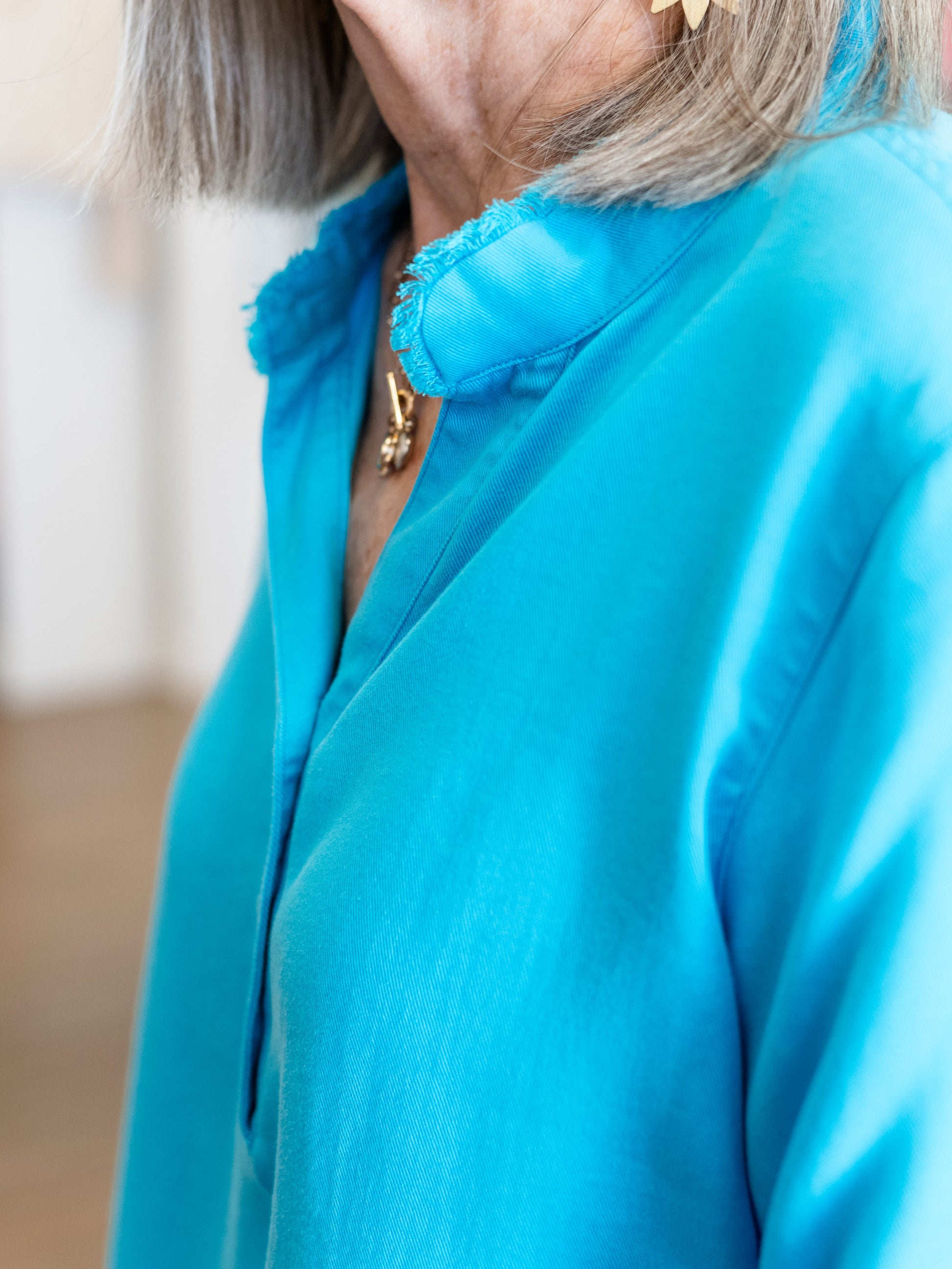 The stunning turquoise hue pairs perfectly with white denim, ankle pants, or your favorite printed bottoms for a fresh, coastal-inspired outfit.
